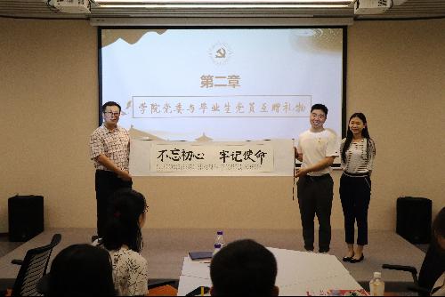 活动中,学院党委为毕业生党员们赠送了《我的入党初心》纪念册、《党性的诠释》书籍和“不忘初心印章”,将党员们的《入党申请书》重新印制、排版、装订,赠予毕业生党员留作纪念,激励毕业生党员勿忘初心、砥砺前行,做爱国、励志、求真、力行的时代新青年。