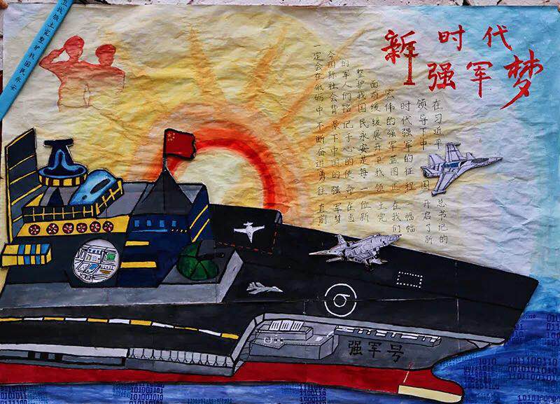 该作品融合了水彩、剪纸、雕刻、书法等元素,描绘了一幅新时代强军兴军的新风采,图文并茂、色彩丰富、层次分明。板报主题上的“新”字融入了代表着国家繁荣昌盛的“华表柱”,板报以初升的太阳的为背景,象征着强大的生命力、广阔的发展前景和稳健提升的综合国力;板报的主体是以“辽宁号”为原型创作的“强军号”航空母舰以及代表着我国国防科技实力的“信息海”,表达了我国稳步推进的国防信息化战略和应对信息化战争的坚定信心;此外,板报左上角以剪影的方式展现了中国军人挺拔的姿态,他们用汗水与忠诚谱写着人生的真谛,用生命来捍卫祖国的领土完整和人民的喜乐安宁。同学们借由此描绘新时代的强军蓝图,也借由此抒发对国防教育的思考和对中国军人的敬意!