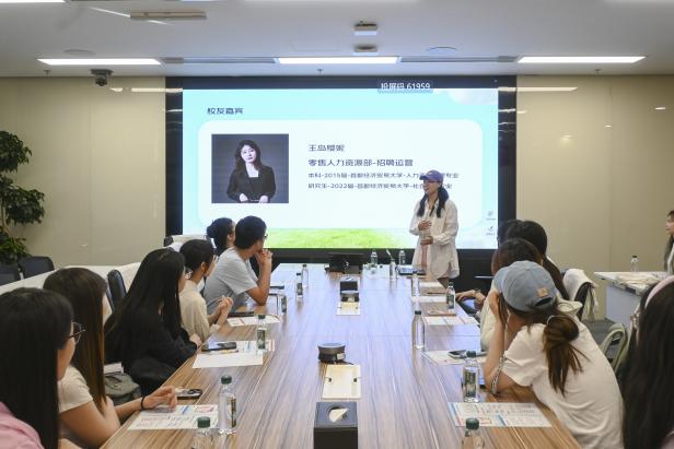 随后,京东零售、采销以及直播运营校招负责人杨依含校友进行了专业而深入的分享。她立足自身在京东的工作实践,系统性地介绍了企业的发展定位与业务布局。杨依含特别强调,京东不仅是互联网科技企业,更是数实融合催生的新型实体企业。她详细阐释了京东“根植于实体经济、成长于实体经济、服务于实体经济”的三大发展特征。在业务层面,她重点解读了京东零售的战略定位——“以供应链为基础的友好交易平台”,指出京东通过持续优化成本、效率、产品、价格和服务,致力于实现“多、快、好、省”的消费体验,同时助力合作伙伴降本增效,推动行业高质量发展。