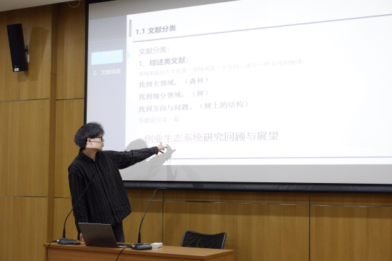 知识库中文献浩如烟海,如何挑选需要的文献阅读是重中之重。白桁宇为同学们介绍了文献检索的有效方法。首先,要了解基本文献分类。现有文献一般分为三种类型:综述类文献、研究类文献以及方法类文献,分别对应确定论文研究领域方向,为论文写作提供参考和为论文中创新方法提供理论支撑的作用,在论文写作时注意选用。