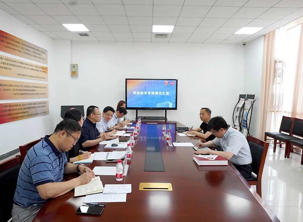王文举听取学院工作汇报并指导工作。他强调,要紧抓深入开展学习贯彻习近平新时代中国特色社会主义思想主题教育的契机,进一步提升学院基层党建工作的规范化水平,以高质量党建引领学院事业高质量发展;要加快构建新时代中国特色社会主义劳动科学和人口科学,紧紧围绕当前国家重大现实需求,体现服务首都的区域特色,强化有组织科研,鼓励“顶天立地”的科研产出;要加强教师队伍建设,加大高水平领军人才的引进力度;要积极探索开拓劳动教育,促进“五育”融合发展,不断提升毕业生深造率;要提升国际化办学水平,不断拓展中外合作交流项目。