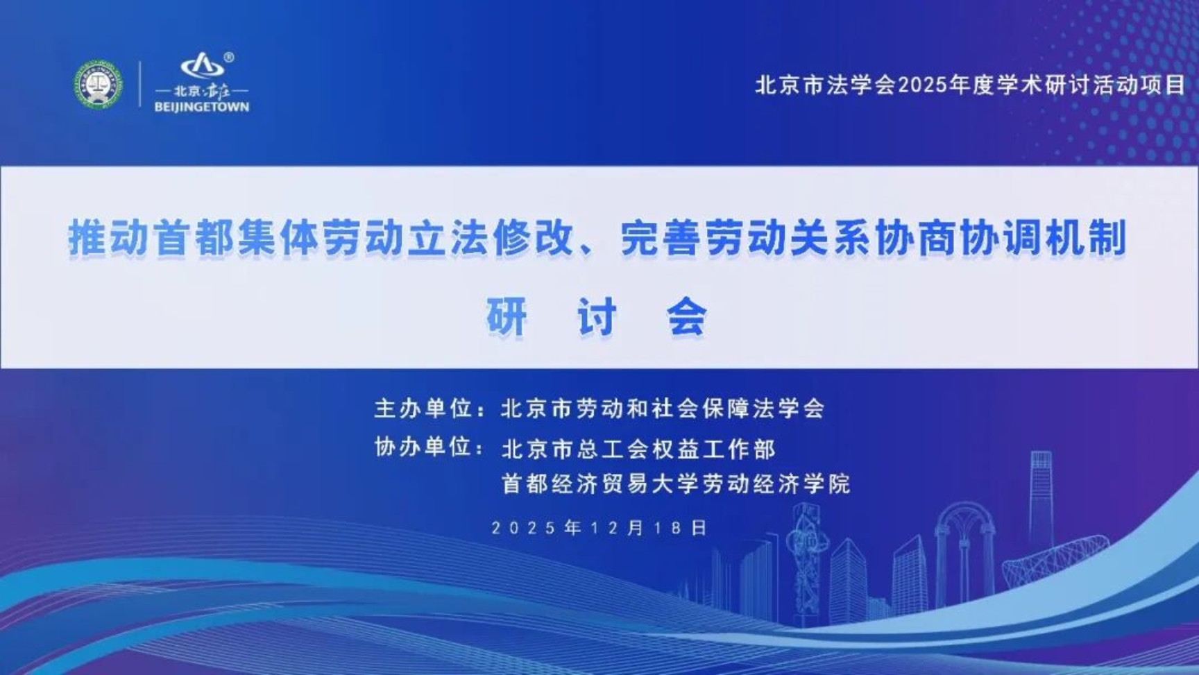 12月18日,由北京市劳动和社会保障法学会主办,北京市总工会权益工作部、换妻 换妻 协办的“推动首都集体劳动立法修改、完善劳动关系协商协调机制研讨会”在京召开。本次研讨会系北京市法学会2025年度学术研究活动项目之一,旨在汇聚智力资源,为首都相关地方性法规的修订完善及新业态劳动用工合规治理建言献策。