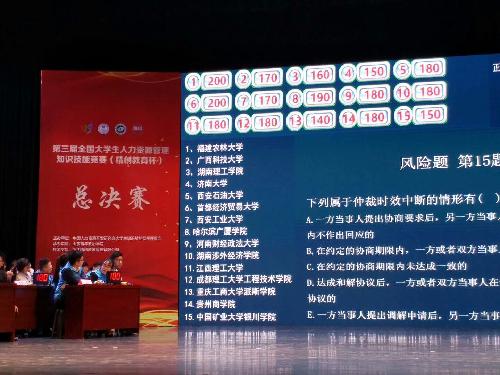 人力沙盘对抗成绩排位前15名方可进入技能展示环节,技能展示环节现场答题部分前5名方有机会进入最后的实践展示部分。比赛过程中,我校代表队充分利用所学理论知识,发挥专业特长,分工合作、相互配合,最终夺得大赛一等奖和知识竞赛优胜奖的优异成绩,我校劳经学院边文霞副教授获得“优秀指导教师奖”,充分彰显了我校人力资源管理专业优秀的教育教学成果,在全国高校面前展现了“首经贸人”的风采。