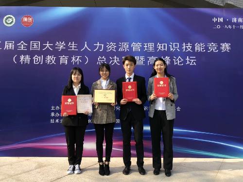 2018年11月3-4日,第三届全国大学生人力资源管理知识技能竞赛总决赛(精创教育杯)在山东青年政治学院举办。由我院安书慧、高歌、陆宣先以及工商管理学院石俊豪四位同学组成的换妻 代表队,荣获大赛一等奖、“知识技能竞赛优胜奖”,边文霞副教授荣获“优秀指导教师”奖。