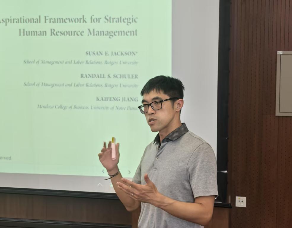 在主讲环节,姜铠丰教授带来了题为《人力资源管理系统的前因研究——基于利益相关者生态视角的新探索》的精彩报告。他系统梳理战略人力资源管理40多年来的经典文献,呈现人力资源管理系统的前因变量研究脉络及其战略导向性,并结合其与相关学者的实证案例解析利益相关者生态理论的多个应用场景,指出人力资源管理系统的前因探索是战略人力资源管理的未来主要研究方向之一,有效地回应了学界对拓展和深化战略人力资源管理未来趋向的研究呼吁,为学界和业界提供重要决策参考。
