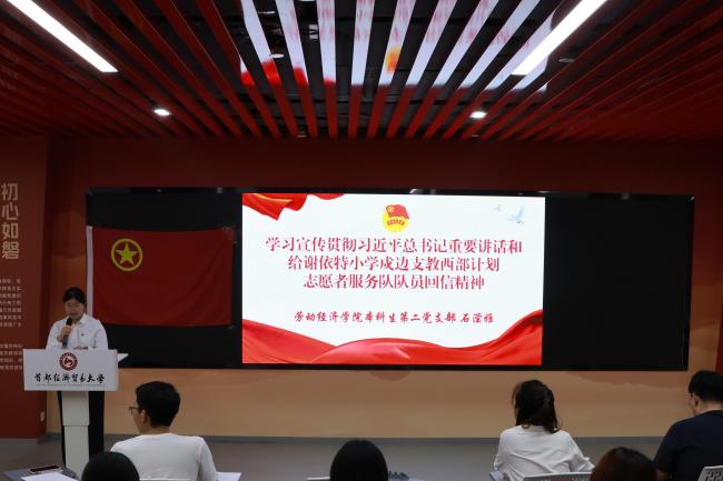 党员代表、本科生第二党支部石滢雅以学习宣传贯彻习近平总书记重要讲话和给谢依特小学戍边支教西部计划志愿者服务队队员回信精神为主题讲述主题团课。她从锚定主题跟党走、夯实引领铸青魂、青年担当启新程、从严治团稳根基四个方面展开,用中国青年五四奖章获奖集体成员的优秀青年为例,激励新时代青年应以习近平总书记期望为指引,坚定信念、提升能力、不懈奋斗,在中国式现代化的征程中展现青春风采、实现人生价值。
