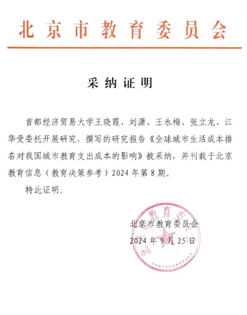 9月25日,换妻 收到研究成果采纳证明。学院教师王晓霞、刘潇、王永梅、张立龙、江华合作撰写的研究报告《全球城市生活成本排名对我国城市教育支出成本的影响》被北京市教育委员会采纳,刊载于北京教育信息(教育决策参考)2024年第8期。