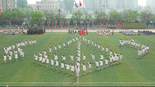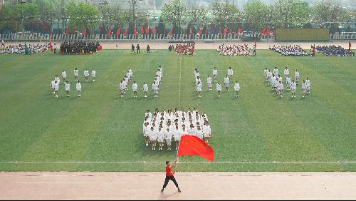 在各院系学生团体操的展示环节中,劳经学院队伍于第十三个登场。学生们喊着响亮的口号,随着高扬挥舞的院旗,奔向操场中央。大家澎湃的激情、高昂的斗志瞬间点燃全场。在3分43秒的展示中,劳经人手持翻花绘就出一幅幅亮丽的图景,CUEB、花朵、三棱锥、奔跑点燃火炬、汉字“梦”,他们用生动的元素传递着青年学子的朝气。旋转、跳跃,他们像跃动的精灵。萌动的春花,象征着青春与活力。