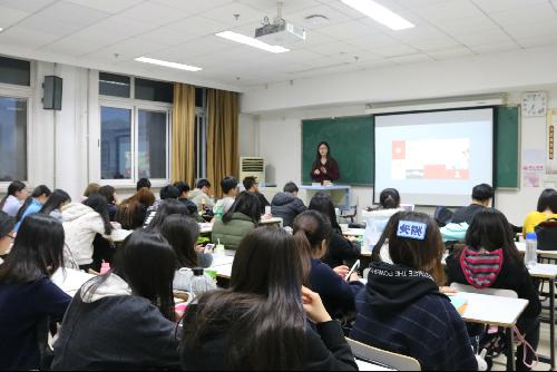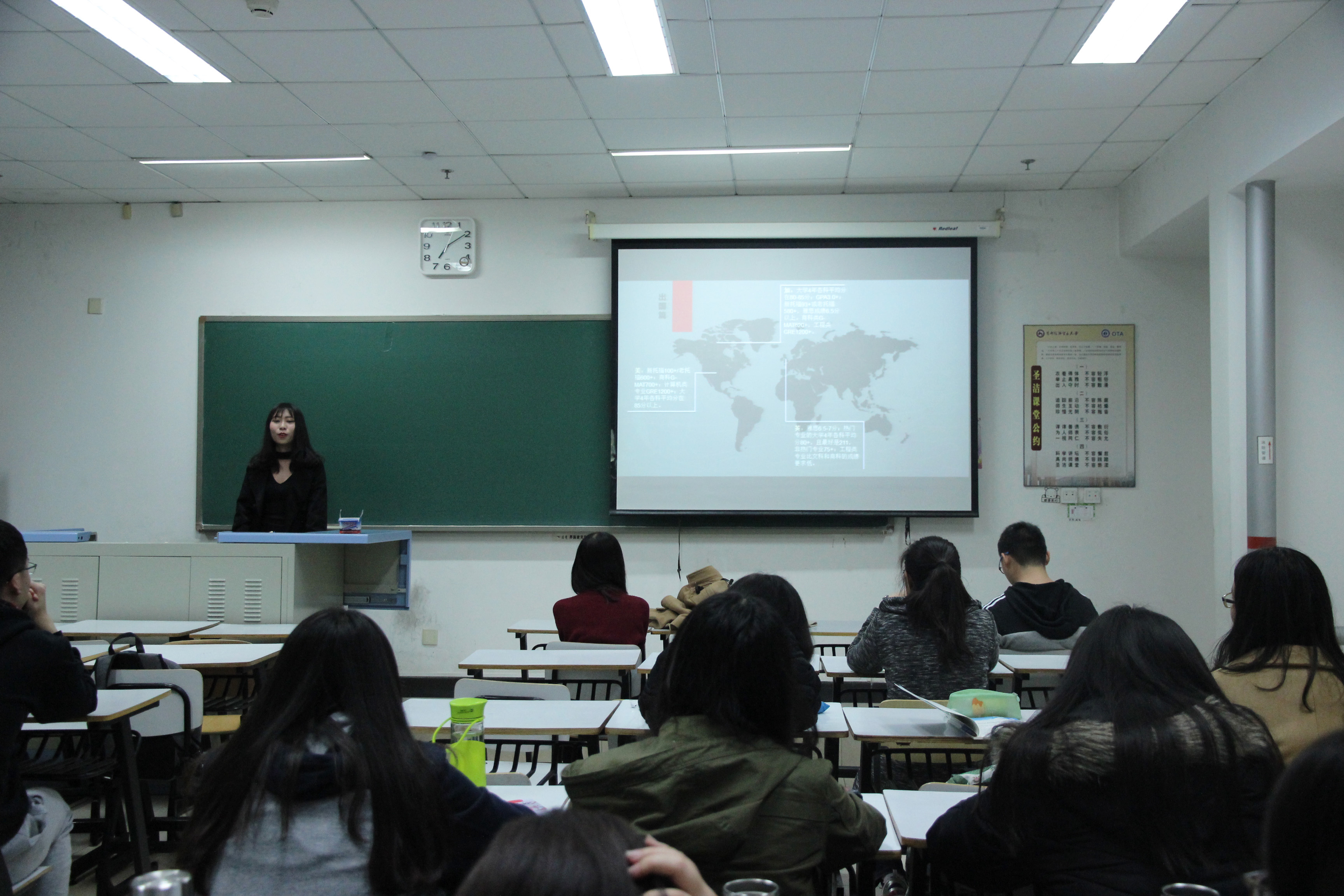 最后是对于出国部分的介绍。班助向大家简要介绍了近几年主要的留学方向,如美国、加拿大、澳大利亚等国家的基本状况及相关大学的申请条件,让同学们对于出国有了一个直观清晰的理解。同时还对职业生涯规划的相关知识进行了介绍,鼓励同学们大学四年要坚持努力,不负青春。