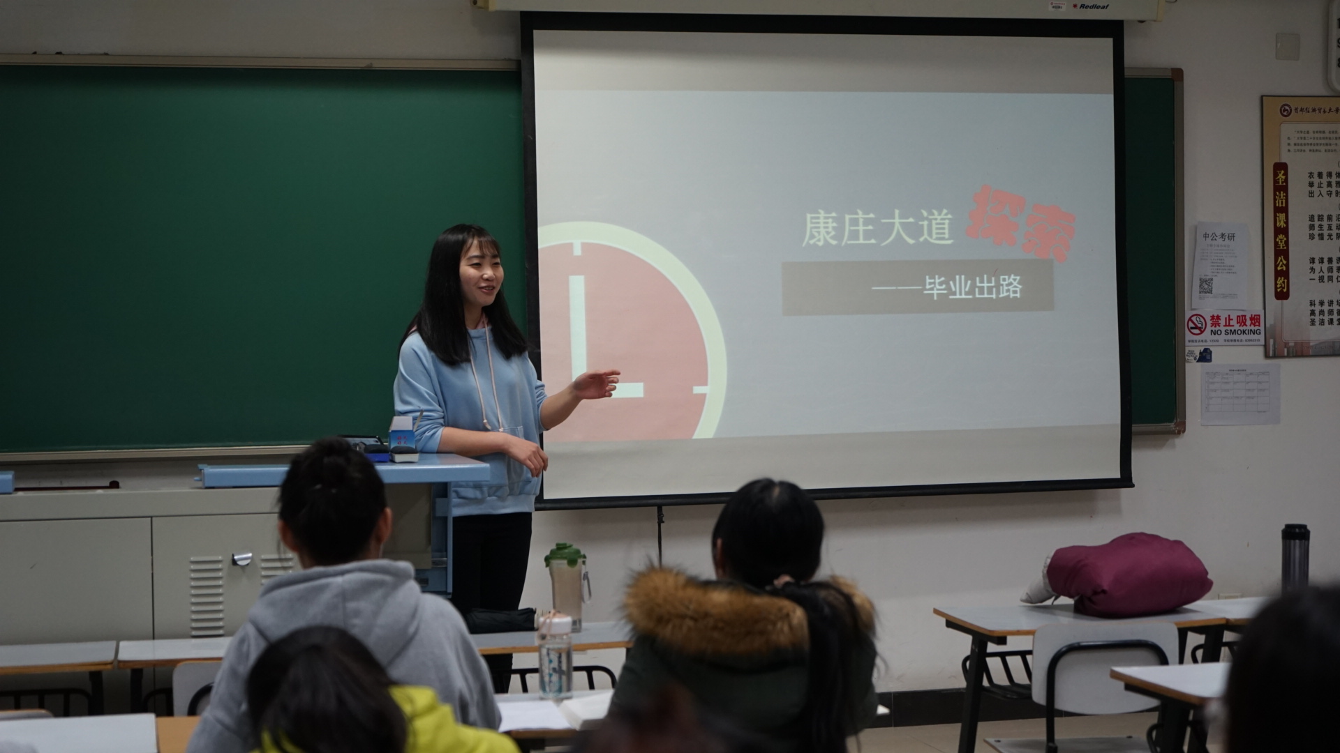 首先,班助在了解及询问各个同学的对毕业后直接就业的理解与打算后,以自己的亲身经历为例向同学们介绍了他自己的生涯规划,并由此引入了另外一条毕业走向——考研。