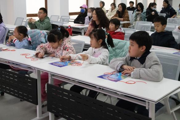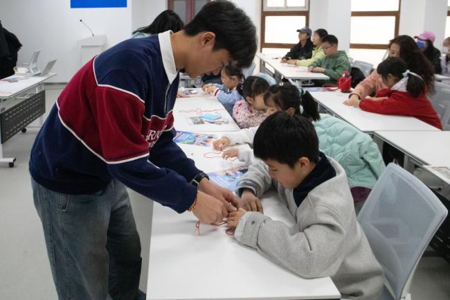 2024级人力资源管理班尤圣凯为小朋友们讲解中国结的相关知识。他用生动易懂的语言,梳理了中国结从石器时代到当代的发展脉络,并结合历史典故,逐一展示常见结式,让孩子们在轻松愉悦的氛围中读懂中国结的美好寓意,感受传统手工艺的魅力。