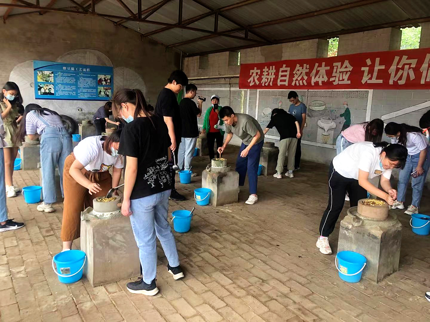 接下来,同学们前往豆浆作坊,每两人一组进行了磨豆浆劳动。工作人员介绍了大豆的种植、收获、筛选与浸泡,向同学们演示了如何用石磨这一传统工具磨豆浆。听完介绍后,同学们兴致勃勃地投入了磨豆浆劳动,有的小组很顺利地磨出了豆浆,有的小组则进展不顺利。老师和工作人员提醒大家,磨豆浆如同吃饭,要少量多次和细嚼慢咽,每次加豆子不能贪多,要少加豆子多添水,逆时针转动石磨,才能磨出细腻的豆浆。经提醒后,同学们在实践中逐渐掌握了磨豆浆的诀窍,各组同学均顺利磨出了豆浆。工作人员演示了煮豆浆、卤水点豆腐,同学们将豆腐压制定型,品尝着热气腾腾的豆腐,分享劳动的果实。“纸上得来终觉浅,绝知此事要躬行”,劳动实践的意义就在于让同学们体会到知难行易。