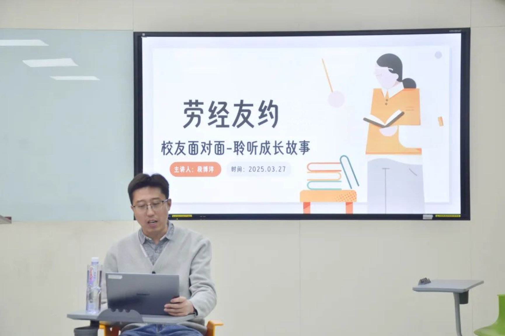 每一次的分享与交流,都是成长道路上的宝贵契机。段博洋学长的精彩分享,不仅为我们带来了前沿的行业见解,更为我们指引了前行的方向。“劳经友约” 后续活动将继续推进,学院已邀请众多商界翘楚和杰出校友参与,他们将走进校园与同学们深度交流,以亲身经历为基础分享宝贵经验。同学们不仅能与前辈近距离互动,聆听奋斗故事,还能从中获取启发、汲取动力,明确未来发展方向,为自身成长积累能量。