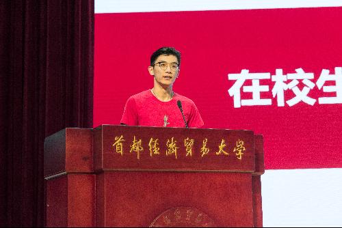 2015级人力资源管理国际班马跃作为在校生代表在典礼上分享了自己在学习、学术竞赛以及学生工作等方面的经验,督促各位同学尽快适应全新的环境;要孜孜进取,践行博学笃行;要守住初心,勇挑时代担当。