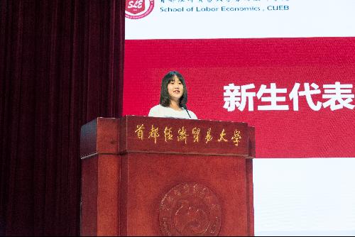 来自2018级人力资源管理专业的本科生新生林晓雪作为新生代表在典礼上发言。她向各位家长、老师们表示了感谢,并希望所有大学新生都能在未来的四年里学会独立、迎接成长;刻苦学习、脚踏实地;不畏挑战、敢于拼搏,践行“崇德尚能·经世济民”的校训精神,坚守初心与梦想,去拥抱这个时代。
