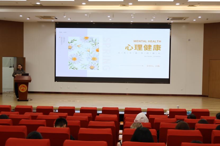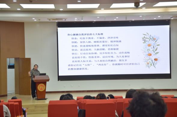 白杨结合实例阐释了开展大学生心理健康教育的重要性。她强调,大学生正处于人生中的青年阶段,最重要的目标就是去认识自我、悦纳自我。接着,白杨让同学们围绕“五快两良好”评估自我的整体健康状况,在点明大学生心理健康标准的同时,向同学们推荐了“自省”这一进行自我探索的方式。
