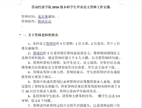 为了确保答辩顺利进行,学院党委和院班子召开专题会议,研讨、布置线上答辩事宜。为了落实学校和学院的要求,学院负责本科生教学工作的老师根据线上答辩的特点制定了《换妻 2016级本科学生毕业论文答辩工作安排》以及《换妻 2016级本科毕业论文答辩论文下载以及答辩评语系统操作手册》,对于参与答辩的老师、答辩学生、答辩秘书以及旁听学生的答辩流程、答辩行为的规范提出了明确的要求,并且为老师和学生通过学校的论文系统下载论文和上传答辩评语提供规范的操作指引。