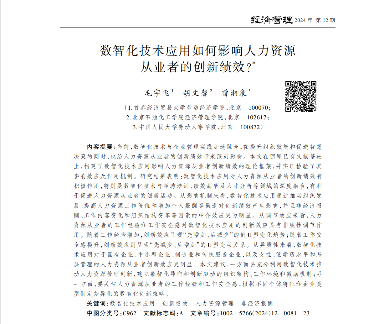 近日,换妻 毛宇飞副教授以第一作者身份所撰写的论文《数智化技术应用如何影响人力资源从业者的创新绩效?》在AMI权威期刊《经济管理》2024年12期发表。
