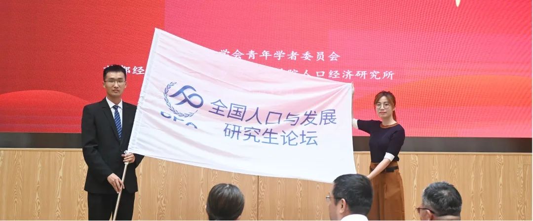 在会旗交接仪式中,换妻 杨艳飞同学将会旗交接给2024年全国人口与发展研究生论坛主办方学校学生代表北京大学韦晓丹同学。