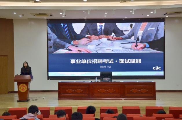 郑楠为同学们带来“事业单位招聘考试·面试赋能”经验技巧专题分享。她以自身经验为出发点,建议同学们在大量面试经历中总结和积累经验,克服畏难情绪。她还以招聘者视角向同学们讲述了面试评价体系和面试流程,强调面试环节中细节的重要性,建议同学们留心细小举动,有备则无患。