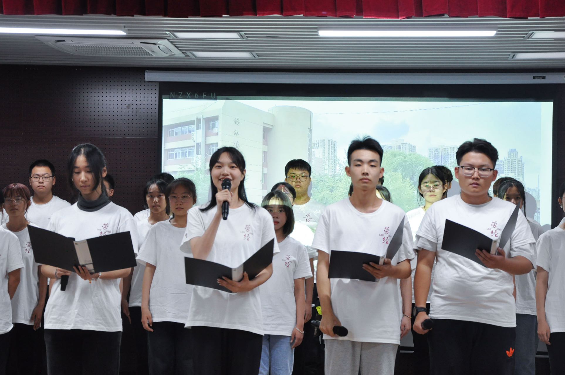 同学们以班级合唱的形式声情并茂地演唱院歌《足迹》,展现新一代劳经人声声不息传承“劳经魂”的风范。