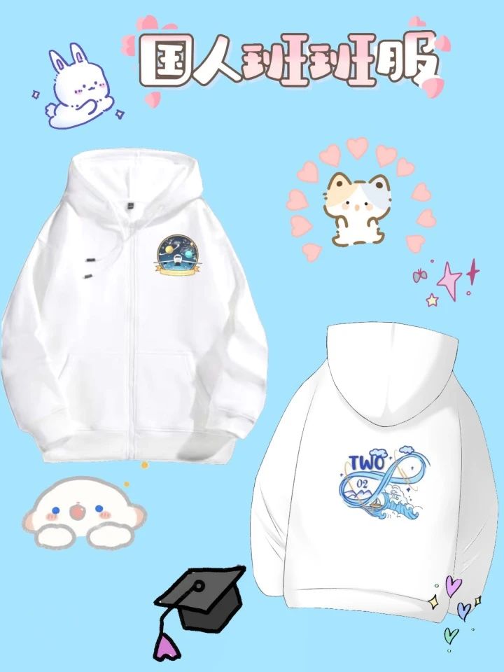 班服:以白色为底色,代表着23级劳经班的大学生涯才刚刚启航,未来的一切充满未知,等待着大家去填补人生光彩。左胸前的小班徽寓意着劳经班的同学们拥有者丰富的兴趣爱好,在具有代表性的吉他和篮球旁边加以劳动经济学五个红字点缀整个班徽,为整件班服在细节上增添了不一样的色彩,也象征了23级劳经班将班级和学院置于心上的意义。