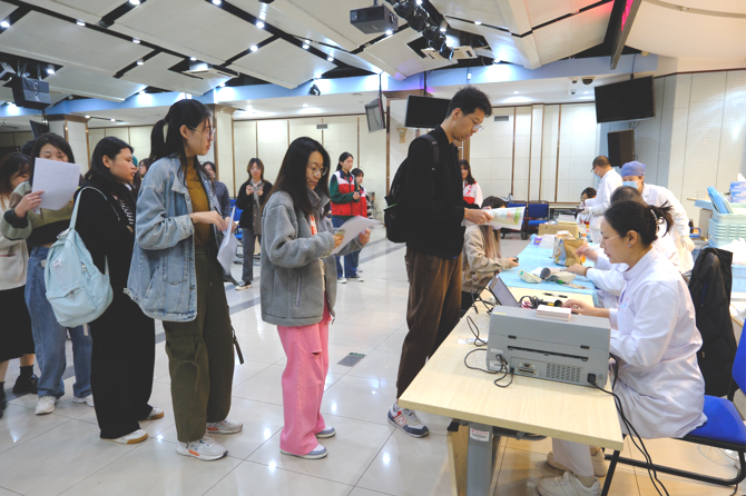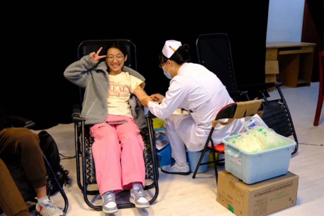 随后,同学们手持献血登记表和身份证,按部就班地参与献血工作。在志愿者的引导下,大家有序排队进行登记体检。经过测量血压、抽血化验、检测转氨酶指数和血型指标等一系列严格的体检流程,同学们带着一丝紧张与期待,开始进行献血工作。卷起衣袖,伸出手臂,绑好压脉带,他们始终目光坚定,一个接一个地完成这场生命力的传递。在这期间,志愿者们贴心的问候和及时递上的红糖水也让这次的献血活动变得温暖愉快。
