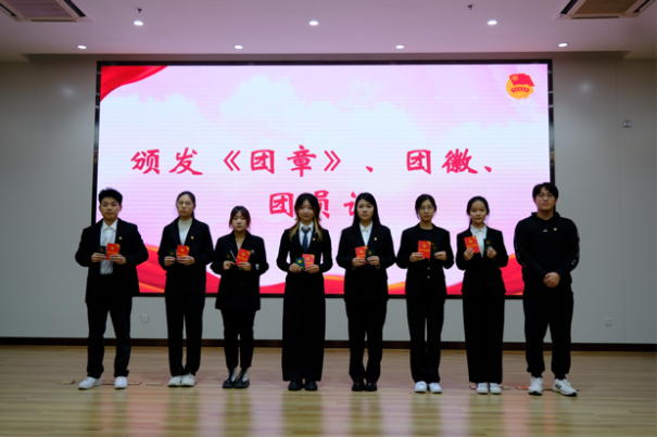 分团委副书记王佳琛为新发展团员颁发团徽、《团章》、团员证,并带领新团员宣誓。新团员一齐举起右拳在团旗下郑重宣誓,入团誓词是每个团员对于团组织庄严的承诺,是团员青年要以实际行动践行和捍卫的誓言。团旗下的宣誓也将使新发展团员更加铭记团员的身份与使命,坚定入团初心和奋斗方向。