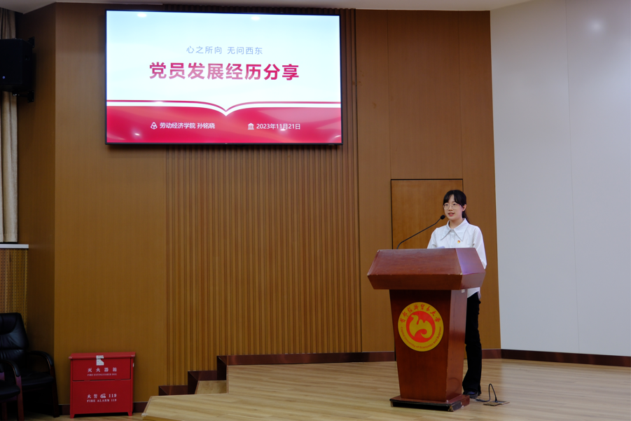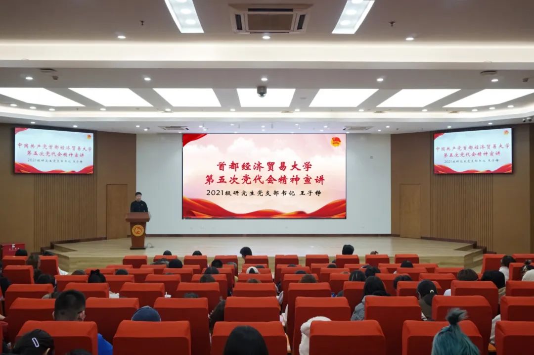 2021级研究生党支部书记王子铮就党代会精神进行宣讲,具体传达了学校今后发展的“六个必须坚持”、总体思路、“两步走”发展战略和“六个必须坚持”等内容。他表示,亲身参与党代会的机会十分宝贵,现场聆听党代会报告感到振奋人心、鼓舞干劲,希望同学们学习真学问、锤炼真本领,通过在校的学习、实践活动,聚焦新时代劳动科学和人口科学建设,主动融入劳动教育,为学校高质量发展贡献劳经学子的赤诚力量。