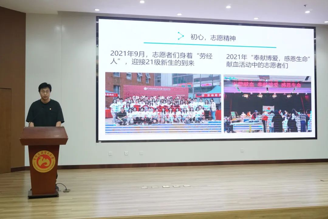随后,分团委志愿者团团长魏嘉祺分享他与学院志愿服务的故事。初入学校的当天,劳经志愿者们热情温暖的工作态度给他留下了深刻印象,从那时起,他便希望可以做这份精神的传承者,身体力行,将温暖与便利传递给每一个劳经人。接下来,他着重分享了区域化团建活动、丰台站值守志愿工作、优秀志愿者分享会等一系列志愿服务经历。通过他的分享,同学们了解到了作为新时代大学生要树立自身良好形象,不断实现自身价值,尽自己最大的能力帮助到更多有需要的人,将热情与温暖的种子播撒,将善良与友爱传播各地。