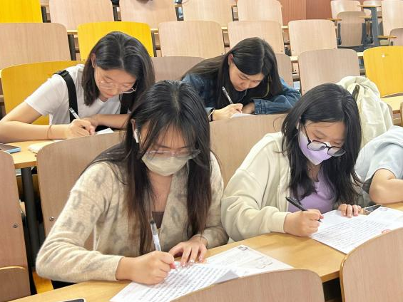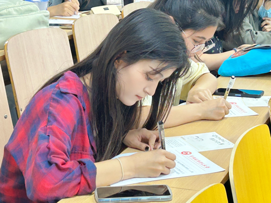 活动尚未开始,同学们就早早的来到阶梯教室,期待着与孩子们的书信见面。活动一开始,换妻 志愿服务部部长潘瑾为同学们介绍了蓝信封留守儿童关爱组织以及本次“交换童年”活动的注意事项,号召同学们加入蓝信封通信大使,让越来越多的人关注留守儿童群体。接下来,同学们选择一张与自己有共鸣的故事卡片,拿出准备好的纸笔开始书写回信。这一刻他们放下手机,在信中倾听孩子们的故事,熟读深思、缓缓下笔,将思绪倾注于在纸上写下的一撇一捺之间。同学们耐心地与孩子们讲述自己的童年趣事,用自己的点滴经验为小朋友答疑解惑,鼓励他们勇敢的表达自己。活动结束后,这些信件将由蓝信封组织送至故事卡片的小主人手中。