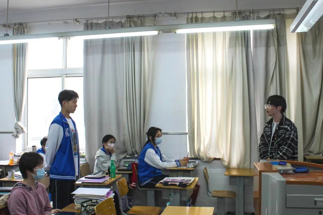 刘芳利针对高考前容易出现的心态问题进行疏解方法上的分享。她分别对处在“巅峰期”和“低谷期”的两类同学,给出有针对性的调整心态的方法,并强调要与老师保持密切沟通已掌握自己的复习情况,调整复习进度。除此以外,她也想同学们分享了自己在缓解压力时的小妙招,例如适当放松,坚持运动、与家人或朋友倾诉等。简单实用的方法配合丰富生动的表达获得班级同学们的认可与共鸣。