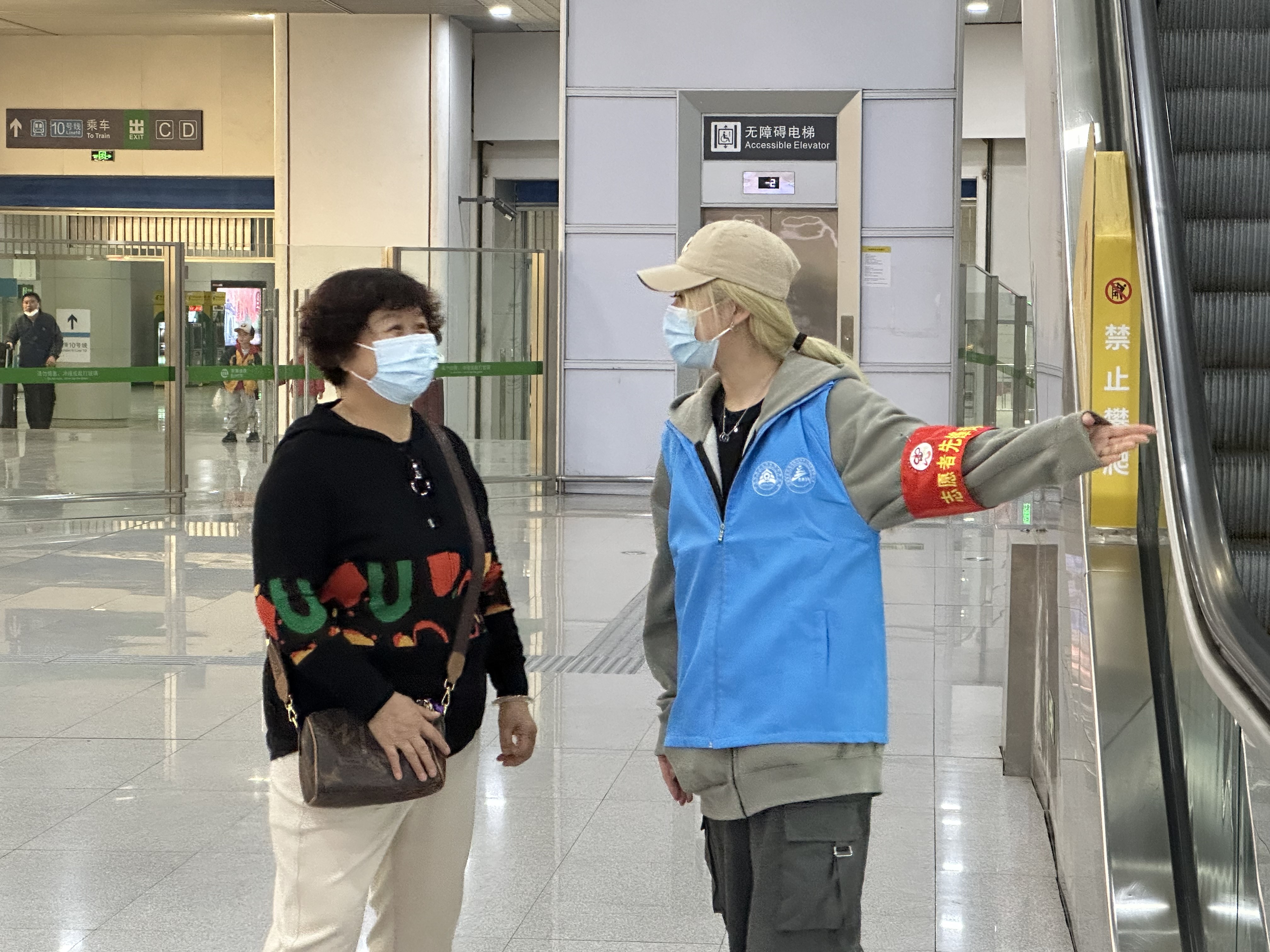 每每火车进站之时,站内的客流量激增,众多不熟悉路线的旅客短暂滞留,容易造成人员堆积与通道堵塞,疏导秩序也因而成为志愿工作的难点。在志愿者领队与车站工作人员的帮助下,志愿者们以标准的引导手势、清晰的谈吐表达、友善温暖的微笑服务于了一波又一波的强劲客流,蓝色的身影在过往人流中坚定而耀眼,形成了站内一道靓丽的风景线。