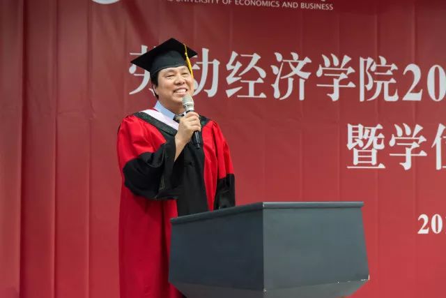毕业典礼上,吴含带领所有毕业生做“劳经学子宣誓”,“……感恩母校、感恩社会、感恩国家,致力于祖国民族的事业兴盛,实现价值,回报师长。乐学、爱业、报国!”的庄严誓词响彻会场。